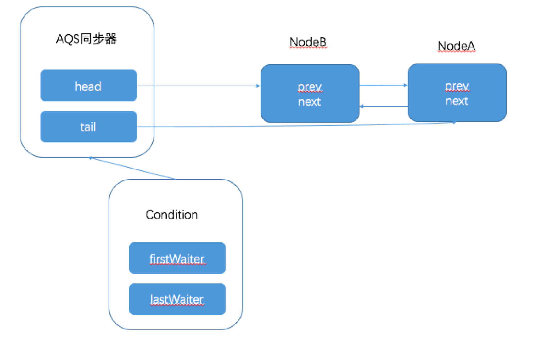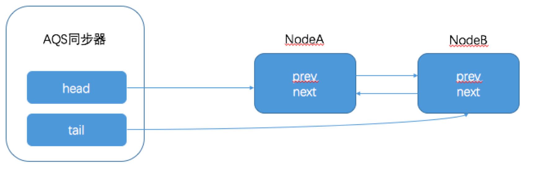 1. AQS的同步队列如下图所示,一个头结点head指向队首,一个tail指向队尾,当线程调用lock()方法获取锁而未成功时,线程被构造成节点加入到队尾。(图中NodeA是同步队列的第一个节点,也就是获得同步状态的节点)