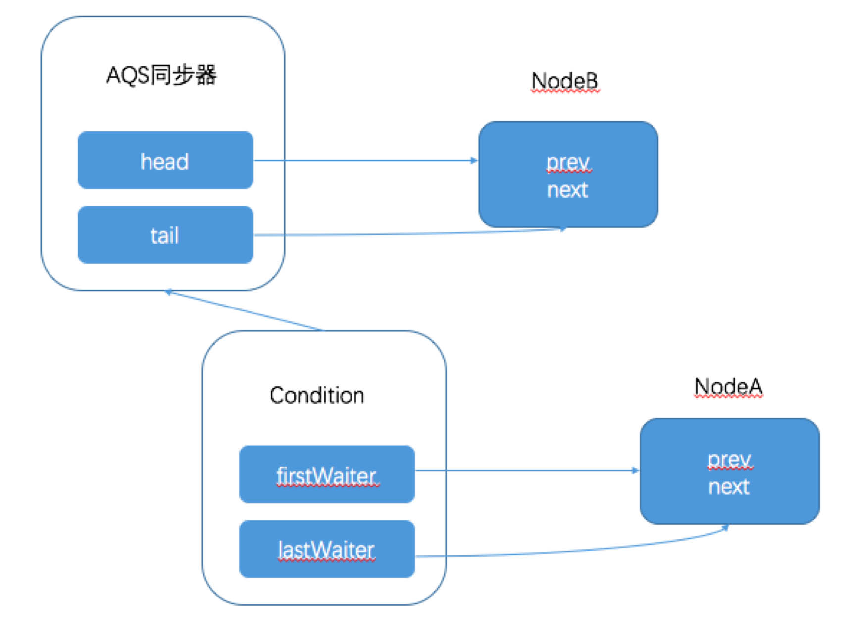 3.执行完第2步后,此时NodeB在同步队列中处于第一个节点位置,即获取到了锁,如果NodeB此时执行signal(或者signalAll)方法,NodeA将会从Condition等待队列中被移除即被唤醒,加入到同步队列中,此时NodeA仅仅是被唤醒有了在同步队列中争夺资源的资格,并不代表被唤醒后就立即获得锁,如下图所示。