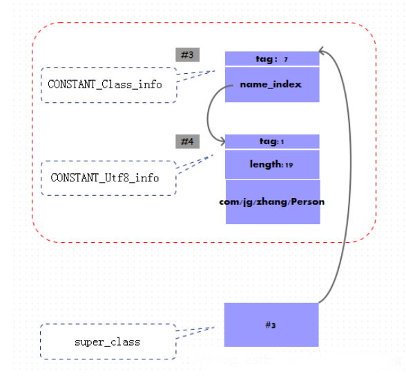 这两项就是当前类的父类的信息。 其中索引为3的constant_class_info会被class文件中的super_class引用。 下面给出示例图(其中虚线范围内表示常量池的区域):