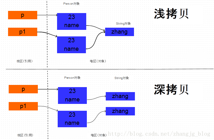 可已看出,打印的地址值是相同的,既然地址都是相同的,那么肯定是同一个对象。p和p1只是引用而已,他们都指向了一个相同的对象Person(23, "zhang") 。 可以把这种现象叫做引用的复制。 (关于引用和对象的区分,可以参考我之前的文章Java中的String为什么是不可变的? — String源码分析 , 其中有一节讲到了引用和对象的区分)。上面代码执行完成之后, 内存中的情景如下图所示:
