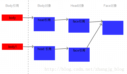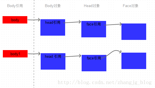 那么,对Body对象来说,算是这算是深拷贝吗?其实应该算是深拷贝,因为对Body对象内所引用的其他对象(目前只有Head)都进行了拷贝,也就是说两个独立的Body对象内的head引用已经指向了独立的两个Head对象。但是,这对于两个Head对象来说,他们指向了同一个Face对象,这就说明,两个Body对象还是有一定的联系,并没有完全的独立。这应该说是一种不彻底的深拷贝。