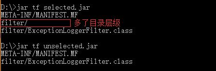 于是又搜索了下,勾选“Add directory entries”和不勾选有什么区别,还真有,通过命令“jar tf selected.jar”就可以查看到jar包中的内容,勾选了的jar包会展示目录层级信息,而没有勾选的就不会展示,估计是展示了目录层级的才能被spring扫描到吧。