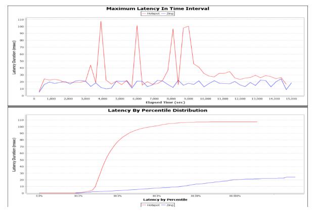 百分比分布表明,在 1% 的时间内,Hotspot JVM 发生的延迟是 Zing JVM 的 16 倍。