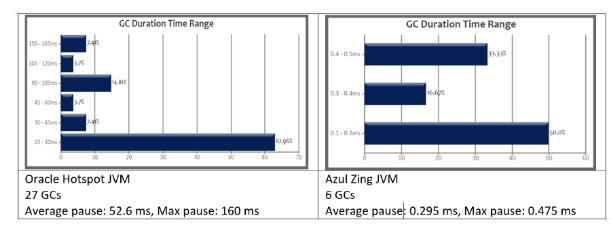 在我们的应用程序中,使用 Zing 的 GC 大约比使用标准 Oracle Hotspot JVM 的 GC 快 180 倍。