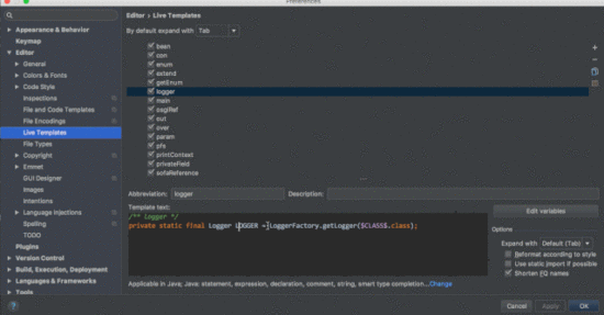 Java 开发过程经常需要编写有固定格式的代码,例如说声明一个私有变量,logger或者bean等等。对于这种小范围的代码生成,我们可以利用 IDEA 提供的 Live Templates功能。刚开始觉得它只是一个简单的Code Snippet,后来发现它支持变量函数配置,可以支持很复杂的代码生成。下面我来介绍一下Live Templates的用法。