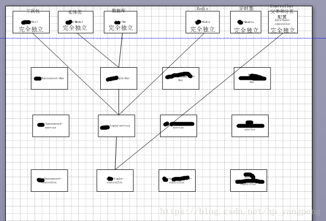 其中dao、service、controller分别依赖db、model、quartz、redis、util、baseController,具体依赖关系如下图所示: