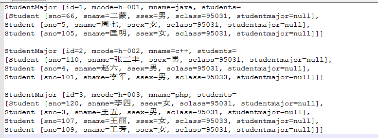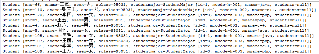return "Student [sno=" + sno + ", sname=" + sname + ", ssex=" + ssex + ", sclass=" + sclass + ", studentmajor="