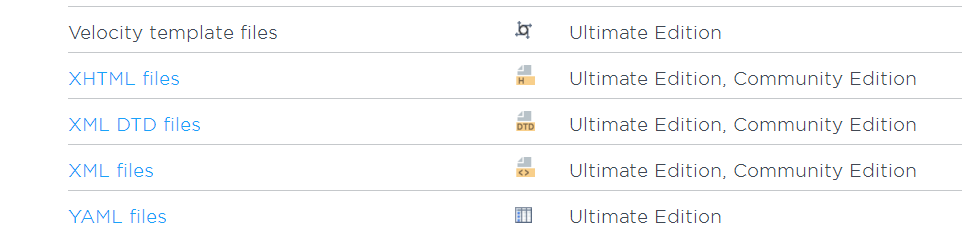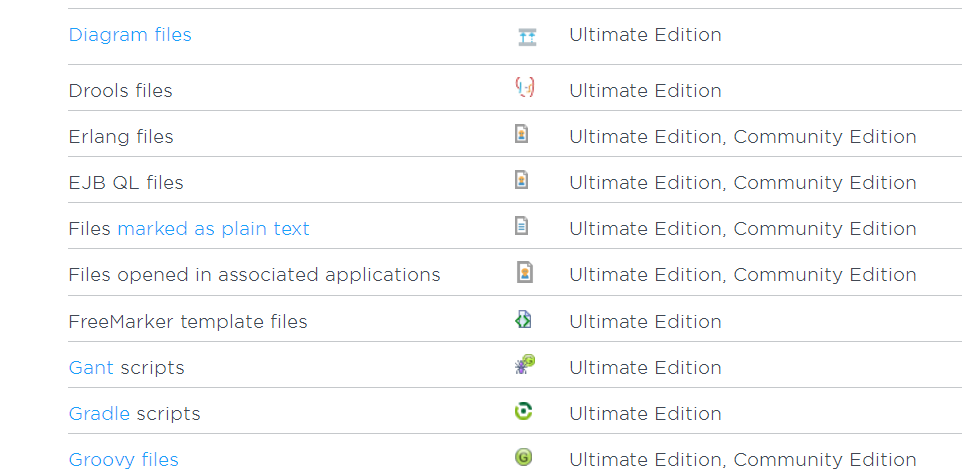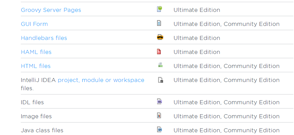 IntelliJ IDEA 识别众多的文件类型,每一个文件类型都用一个特殊图标表示,也允许自定义的文件类型。每个文件类型与一个或多个特定的模式进行关联扩展。文件类型及其扩展可以在文件类型的对话框中进行配置。默认的文件类型包括: