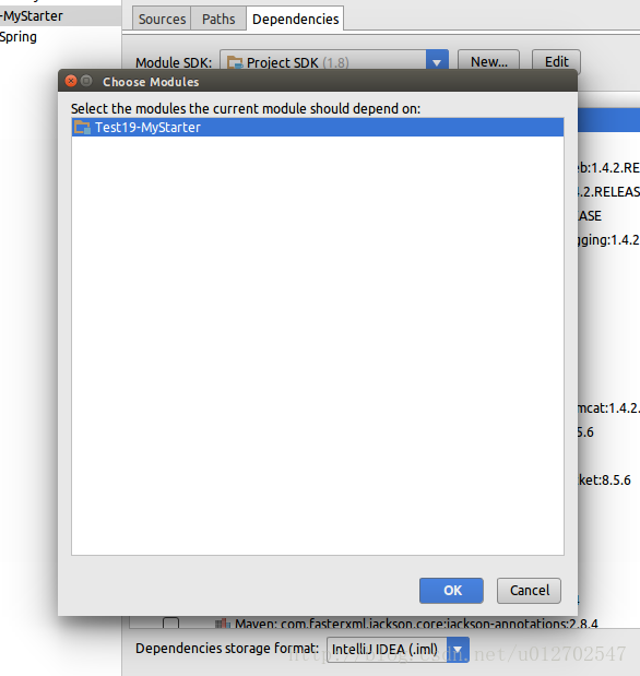 创建module方式很简单,选中刚才的project右键单击,new一个module,这个module是一个springboot项目(不清楚怎么创建springboot项目可以查看这篇文章初识spring boot框架),创建成功之后选择新建的module按f4打开module设置,然后选择右边的加号添加依赖,如下: