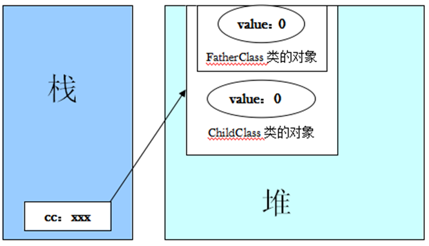 程序执行到这里时,首先在栈空间里面会产生一个变量cc,cc里面的值是什么这不好说,总而言之,通过这个值我们可以找到new出来的ChlidClass对象。由于子类ChlidClass是从父类FatherClass继承下来的,所以当我们new一个子类对象的时候,这个子类对象里面会包含有一个父类对象,而这个父类对象拥有他自身的属性value。这个value成员变量在FatherClass类里面声明的时候并没有对他进行初始化,所以系统默认给它初始化为0,成员变量(在类里面声明)在声明时可以不给它初始化,编译器会自动给这个成员变量初始化,但局部变量(在方法里面声明)在声明时一定要给它初始化,因为编译器不会自动给局部变量初始化,任何变量在使用之前必须对它进行初始化。