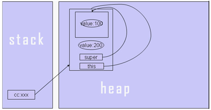 这里调用重写之后的f()方法,方法体内的第一句话:“super.f();”是让这个子类对象里面的父对象自己调用自己的f()方法去改变自己value属性的值,父对象通过指向他的引用super来调用自己的f()方法,所以执行完这一句以后,父对象里面的value的值变成了100。接着执行“value=200;”这里的vaule是子类对象自己声明的value,不是从父类继承下来的那个value。所以这句话执行完毕后,子类对象自己本身的value值变成了200。此时的内存布局如下图所示: