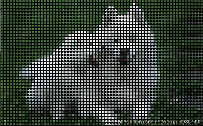 //网格化实现 public void drawGrid(String path, Graphics gr){ int [][] img = getImgPixel(path); buffG = new BufferedImage(img.length, img[0].length, 1); Graphics buff=buffG.getGraphics(); //减少像素数量 for(int i=0;i<img.length;i+=10){ for(int j=0;j<img[i].length;j+=10){ int pixel = img[i][j]; Color c = new Color(pixel); int r=c.getRed(); int g=c.getGreen(); int b=c.getBlue(); Color nc = new Color(r,g,b); buff.setColor(nc); //放大像素数量 buff.fillOval(i, j, 8,8 ); } } gr.drawImage(buffG,0,0,null); }
