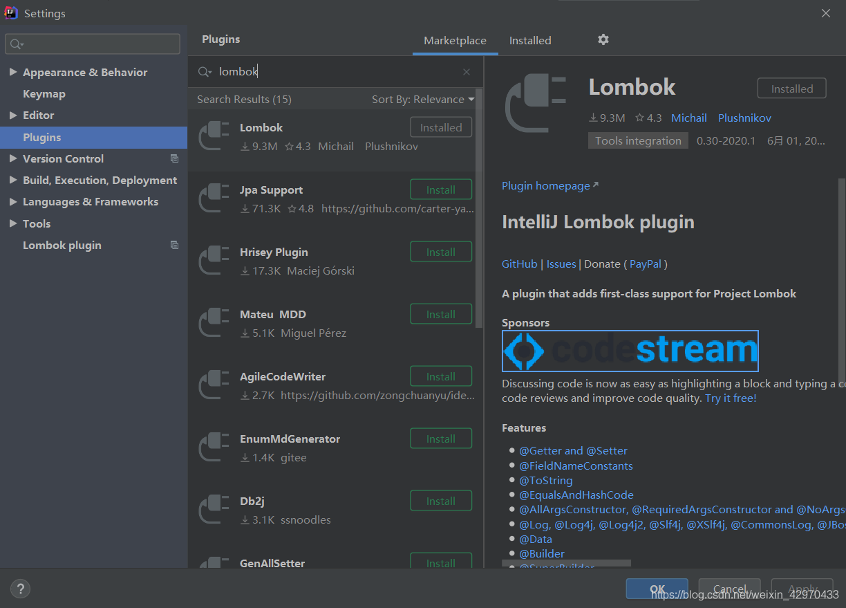 依次点击File—>Settings….—->Plugins,进入界面,在搜索框中输入LOMBOK