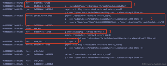 红框3表示的是进入while循环的时候,ImutableOopMap中存储的对象,大家可以看到里面只有r10和rbx,也就是说只有类实例和其中的一个Test实例。