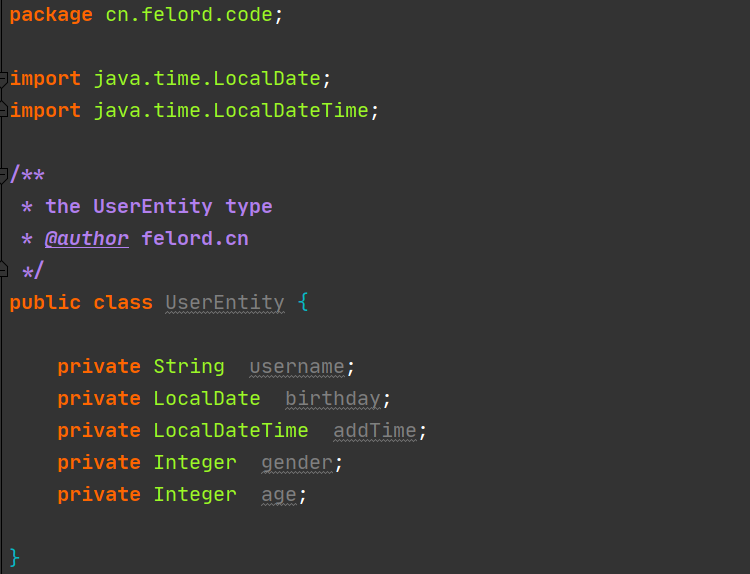通过执行以下代码即可生成一个UserEntity的POJO: