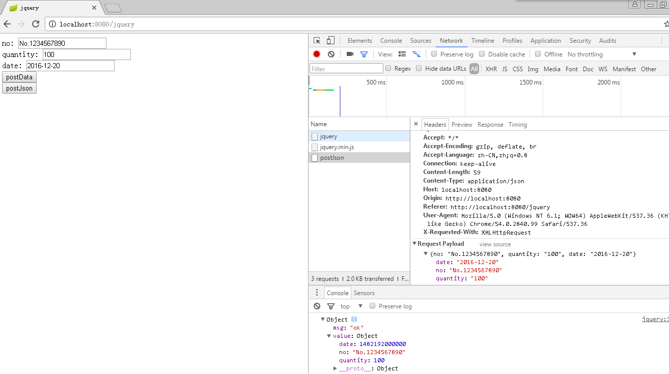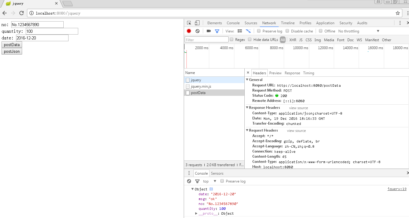 jquery成功的调用了spring mvc的后台方法“public @ResponseBody Map<String, Object> postData(String no, int quantity, String date)”