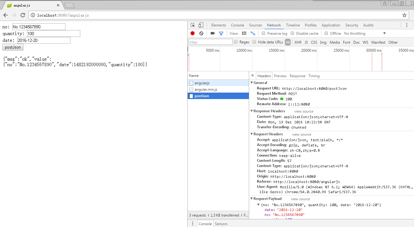 使用angularjs后,依然能调用“public @ResponseBody Map<String, Object> postJson(@RequestBody Order order)”方法。