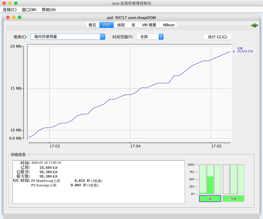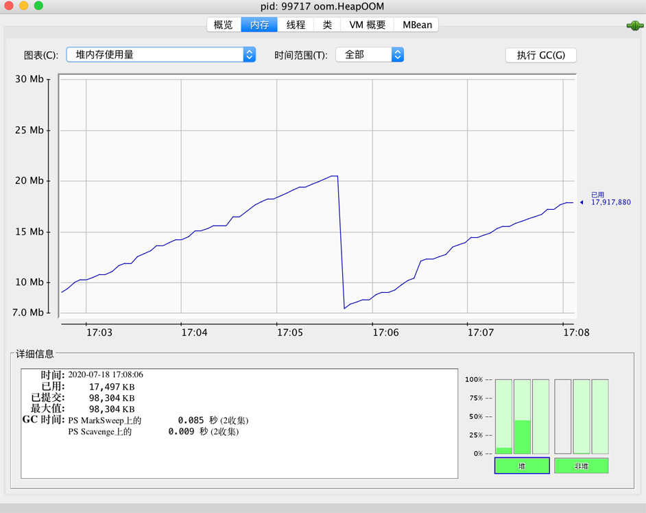 我们打开内存界面,看一下内存,然后点一下GC按钮,这个时候会有一些类进行回收,但是还是会继续增长,看一下下面的图。