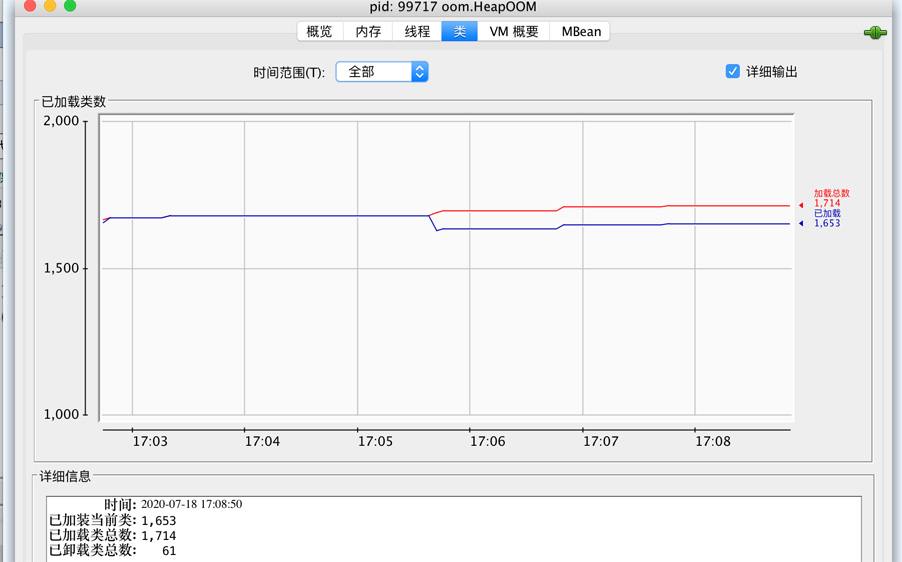 点开信息标签看一下。经过几次GC回收之后,类的数据量还是变化不大,说明没有进行回收。
