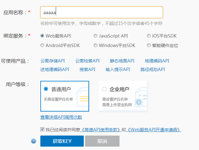 相关的业务,所以选项为Web服务API, 这里你点击获取key就会出现下面的截图