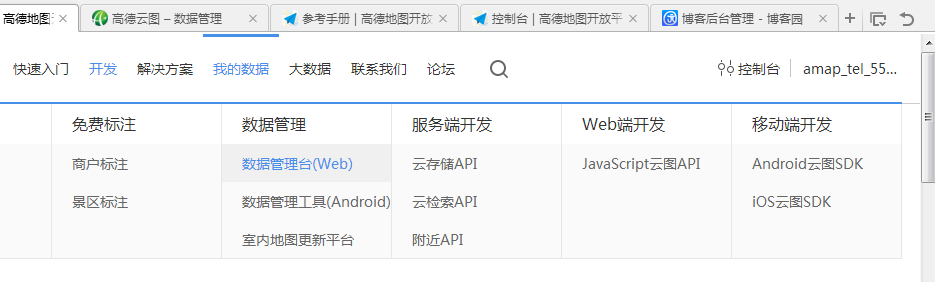 这一步完成,后我们就可以去创建我们要的云图表了,进入控制台,选择鼠标移到我的数据,然后选择下面的数据管理台(Web)进入增加云图表界面