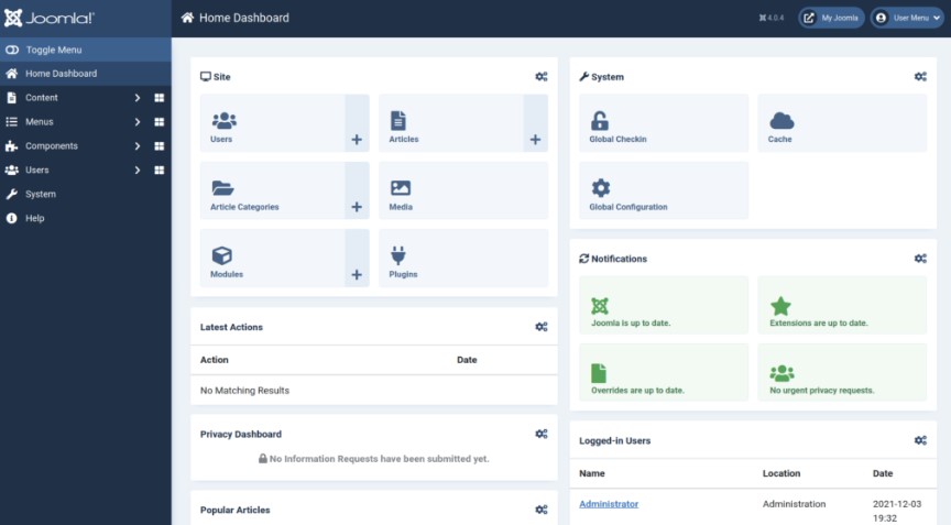 Joomla 4默认仪表盘展示了快速建站所需的常用功能,当然也可以按需定制高级功能。侧边栏会有一些子菜单,为了便于理解,每个功能带有说明标签。在Joomla中新建文章也比较简单,它的编辑器简单易用,带有添加常见html元素按钮,非常适合新手使用,每个版本所带的编辑器会略有差异。