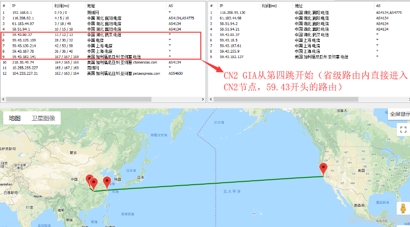 参考上图,我们这里使用的是best trace路由跟踪,第一列显示的IP,后面显示的就是地区,CN2节点为59.43开头的IP地址,如上图的湖北武汉和上海地区都有CN2节点。