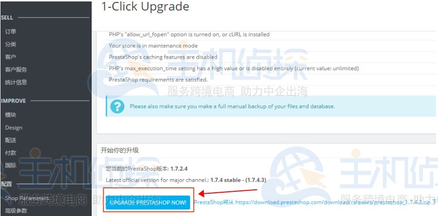 以上是关于PrestaShop自动备份和升级的操作步骤介绍,我们在PrestaShop升级前一定要做好网站数据备份工作,防止数据丢失,造成损失。