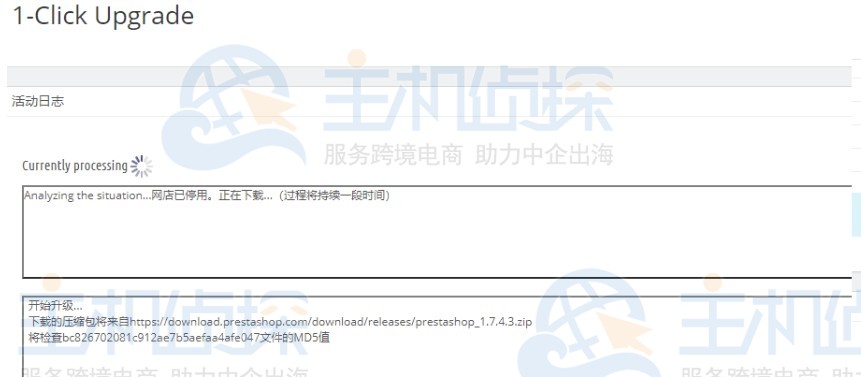 升级过程中首先会下载最新的PrestaShop安装包,由于网络等因素,这个过程可能会比较慢,耐心等待升级即可。