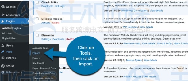 2、FG Drupal to WordPress插件安装并激活后,您可以运行可用的Drupal导入程序。单击WordPress仪表板左侧菜单区域“Tools”,选择“Import”导入,打开导入工具页面。
