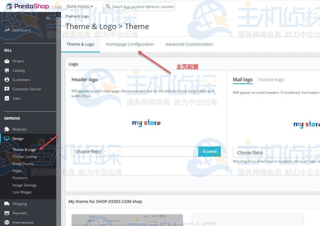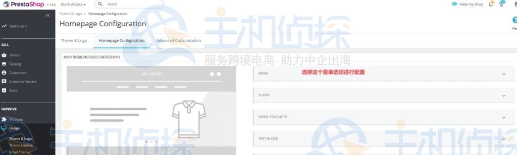 首页上的菜单是在 PrestaShop 1.7 的后台进行调整的。登录进行 PrestaShop 1.7 后台后,选择设计的主题和图标。在弹出的界面中选择 HomePage Configuration(主页配置)。