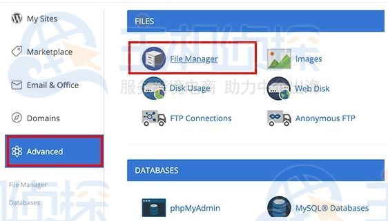 1、登录到BlueHost托管账户仪表盘,然后点击“高级”选项卡下的“文件管理器”图标。