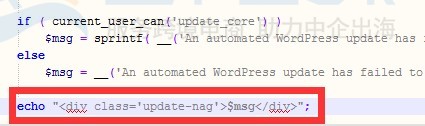 3、删除或注释掉echo“<div class=’update-nag’>$msg</div>”;语句,然后再回到主页面进行刷新下,看问题是否解决。
