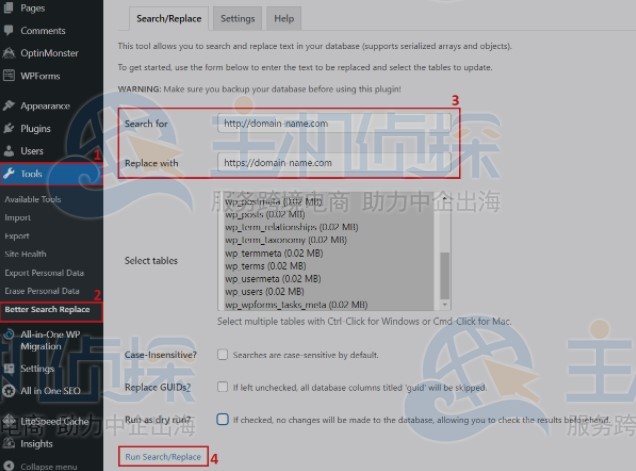 在WordPress仪表板中安装插件Better Search Replace,然后打开工具→Better Search Replace。
