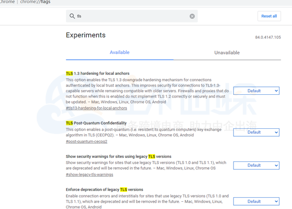 各浏览器都有内置默认SSL协议模块。可以根据不同浏览器进行查看和了解。例如谷歌浏览器SSL协议版本开启并不是通过上述方式查看,可以通过在浏览器的地址栏中加载 chrome://flags/,这将打开 Web 浏览器的实验页面。在搜索区域搜索 TLS或者SSL,可以查看到当前浏览器默认设置和支持的SSL协议和版本如下: