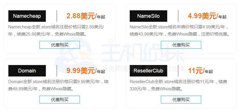 现在越来越多的域名注册商提供store域名的注册,小编之前也整理了下相关的价格,如下图,Namecheap、Namesilo以及ResellerClub都是非常的便宜,还提供免费的Whois隐藏,可以选择。