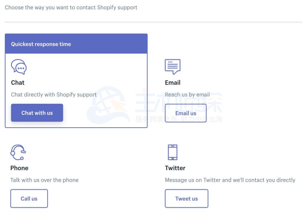 这里我直接点击Get help from the shopify support team联系客服。点击之后Shopify官方提供了四个客服通道给我们,分别是Chat在线聊天,Email邮件,Phone电话,Twitter发送消息。