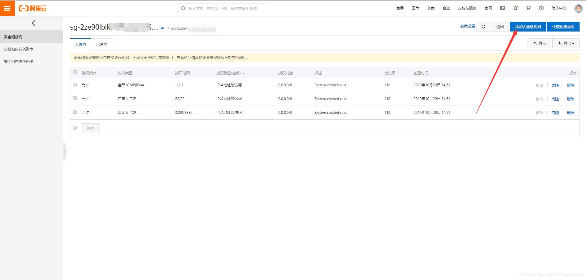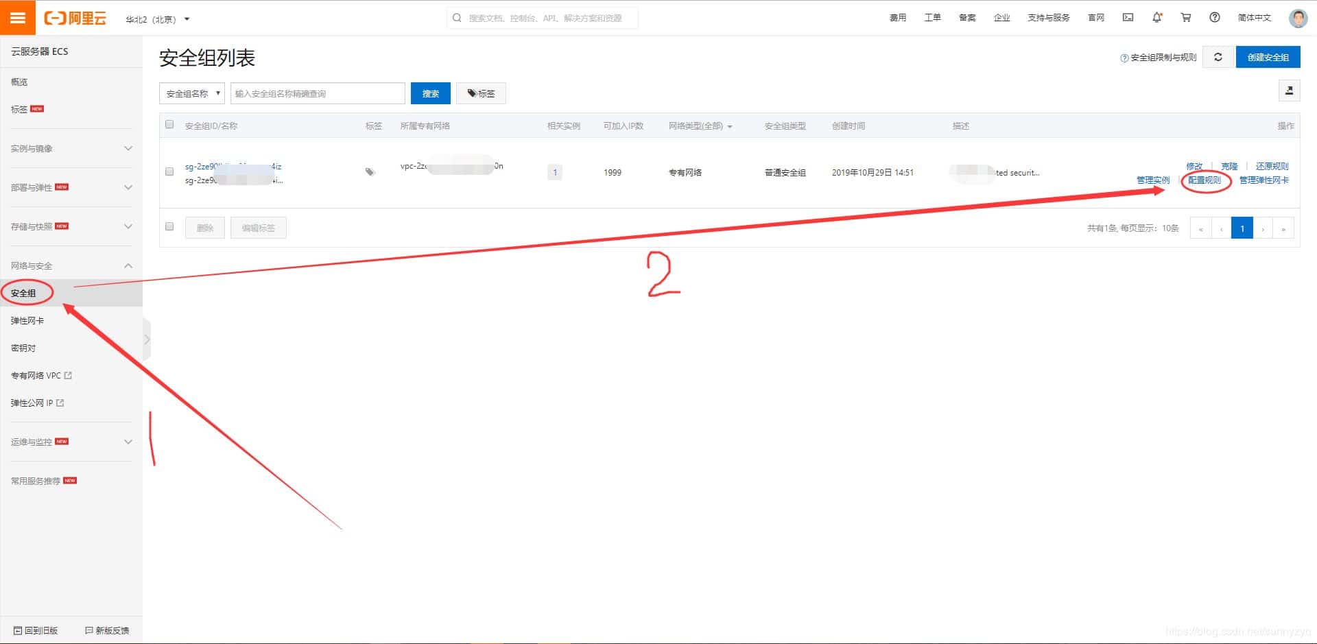 (3)点击【安全组】,找到对应服务器实例的【配置规则】,点击;