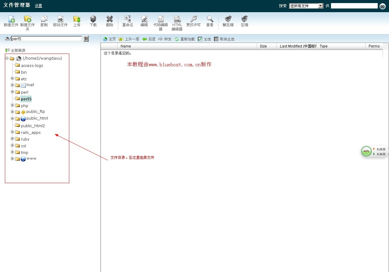 文件管理器,是一个很重要也很常用的功能,和windows的资源管理器类似。我们可以直接在bluehost提供的web界面进行主机的文档管理,