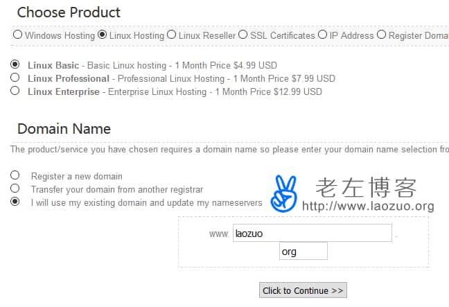 然后根据我们的需要选择系统,是Linux还是Windows,以及是免费享受1个免费域名,还是用自己的域名。如果我们还没确定这款主机稳定性,建议不要就随主机买域名,因为我们退款的时候需要支付域名费用的。我可以先用自己的域名,后面等主机稳定,还可以索要自己的免费域名资格,老左问了官方。