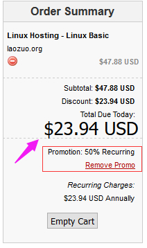 这里我选择一年的,然后我们需要在右侧看到订单购物车,输入优惠码\”Dudrop2015 \”享受半价。