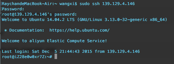 注:中间是阿里云地址,22是端口号。ssh默认使用的协议就是22端口。端口号好根据实际情况输入。
