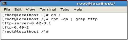 1.在终端下进入root权限,首先看看有没有安装tftp服务器和客户端组件,验证命令:rpm -qa | grep tftp(看图)
