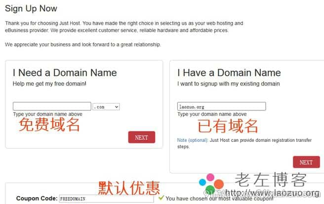 老左建议新手朋友,如果你是第一次购买JustHost主机,不要急于开通他们的免费域名(主机是送一枚域名的),我们可以先使用自己的域名作为绑定。或者自己随便输入域名作为主域名。优惠码默认官方的最低价格。