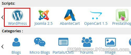 一、登陆主机控制面板,在页面最下面会看到很多开源程序,wordpress是第一个,点击进入;