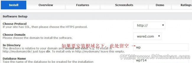 二、点击Install,填写安装路径,需要注意的是如果你要安装在网站根目录下面,In Directory处则留空,如果选择默认的wp,就是安装在你的二级目录下,即:www.yourdomain/wp
