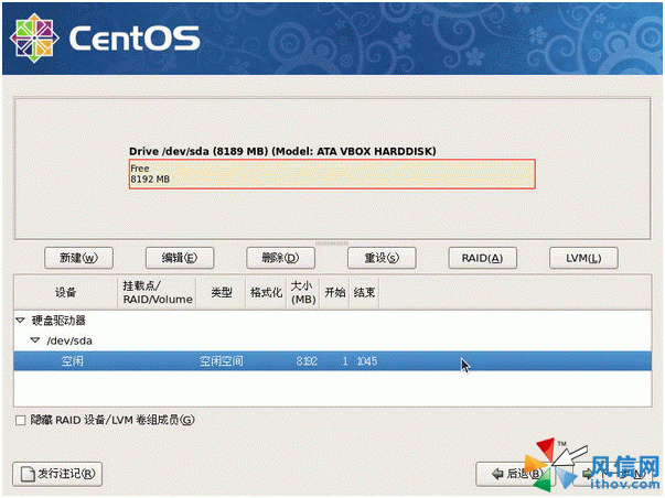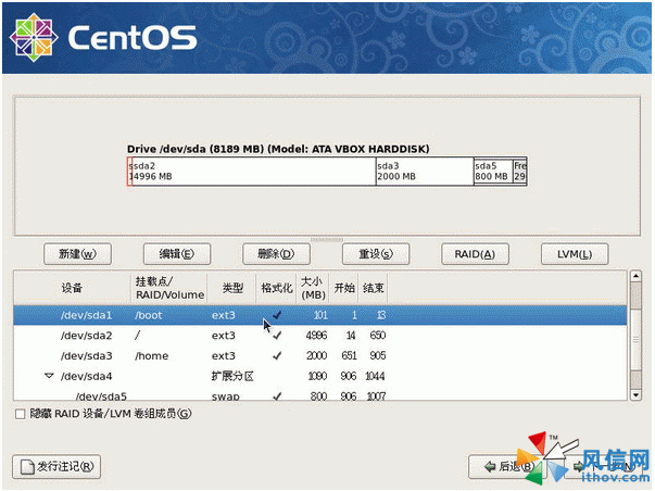 最终建立/boot分区的结果如下所示,他会主动的将/boot这个特殊目录移到硬盘最前面,所以你会看到/boot所在的硬盘分区为/dev/hda1,而起始磁柱则为1号。情况如下图所示: