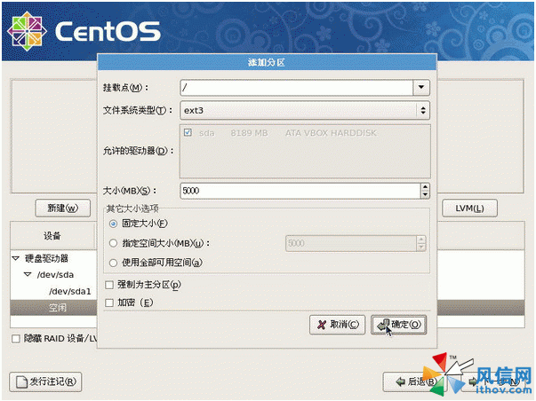 接下来建立根目录(/)的分区。按下“新建”后,就会出现如下的画面。由于我们需要的根目录是使用Linux的文件系统,因此预设就是ext3这个文件系统。 至于在挂载点的地方,你可以手动输入也可以用鼠标来挑选。 最后在大小(MB)的地方输入你所需要的磁盘容量即可。不过由于作者这个系统当中只有一颗硬盘,所以在“允许的驱动器”里面就不能够自由挑选。