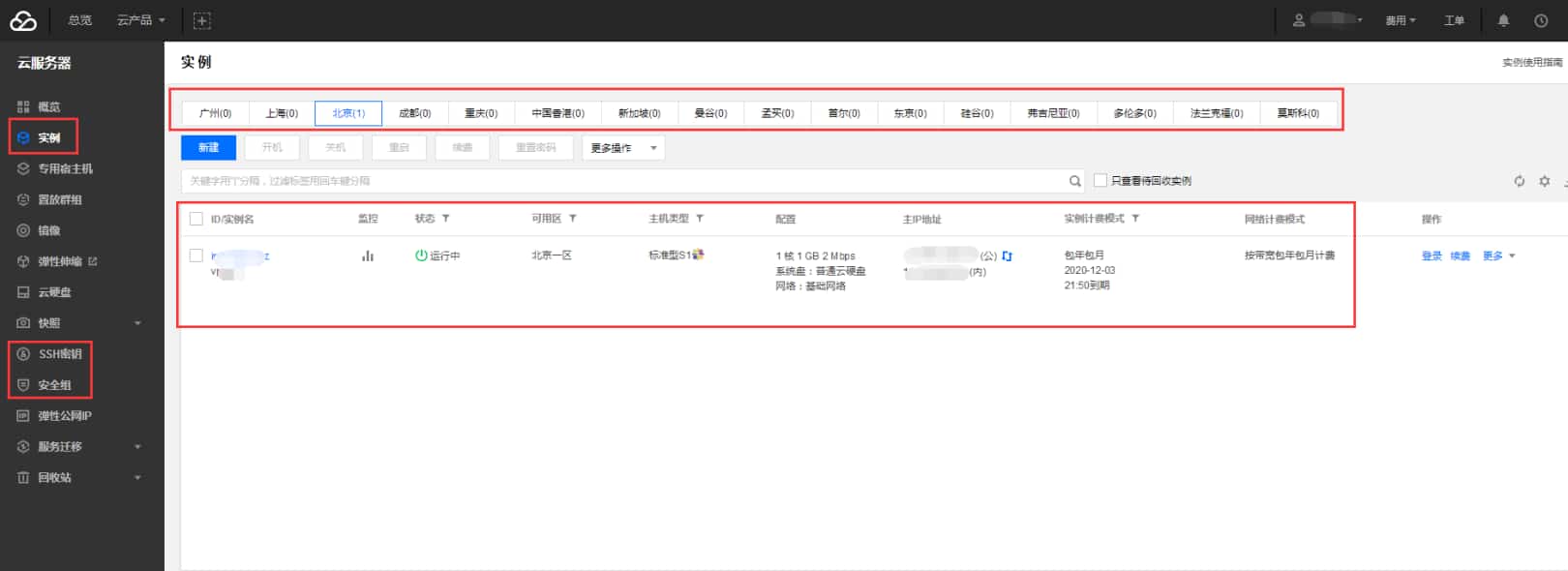 右侧上面的地域要先选择你购买过的地域,才能看到对应的服务器。有人看不到服务器就是因为没选对地域;