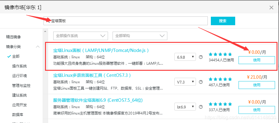 搜索【宝塔面板】,选择0/月的,注意看已使用人数,选择人数多的那个。